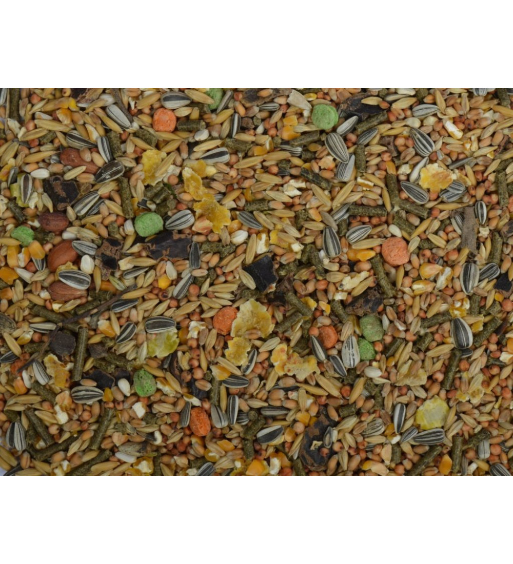 tarwe, grasbrokken, zonnepit gestreept, havermoutmeel, palmpitschilfer, moutkiem, krijt, tarwegies, premix, melasse, kalksteentjes, gerst, johannesbrood, haver, mais, zonnepitten, kardizaad, extrudaten,ontsloten mais, pinda gepeld en erwtenvlokken.