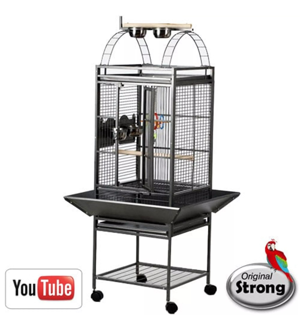 De voederdeurtjes hebben stevige sloten met een innovatief draaimechanisme. Bovenop de kooi bevindt zich een compleet speeleiland met metalen opvanglade. Onderin de kooi zijn een looprooster en metalen schuiflade geplaatst voor eenvoudige hygiëne.